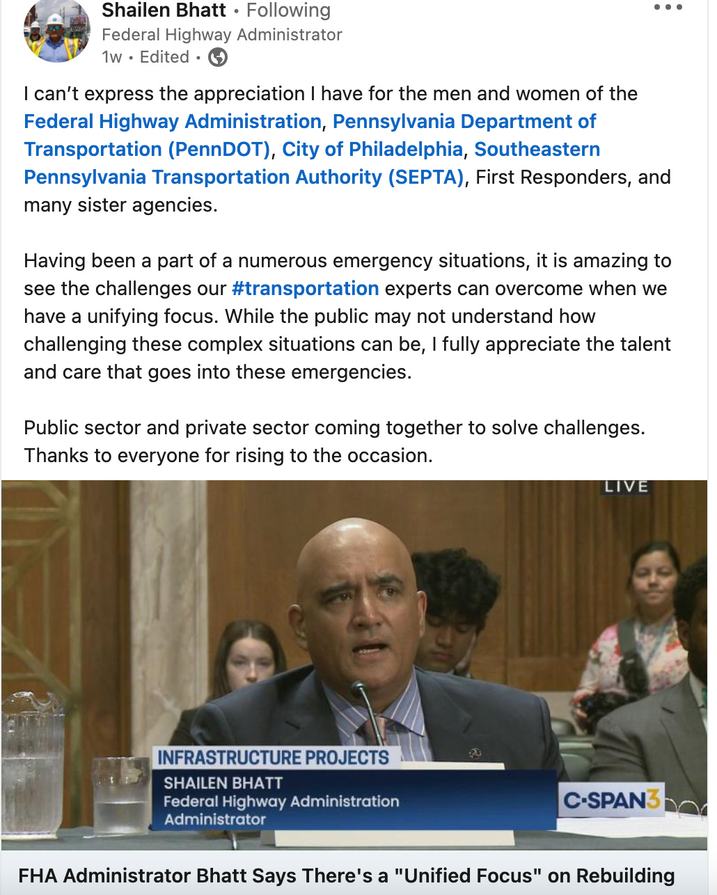 A few weeks ago, FHWA Administrator, and former Colorado DOT Executive Director, Shailen Bhatt posted this on LinkedIn: