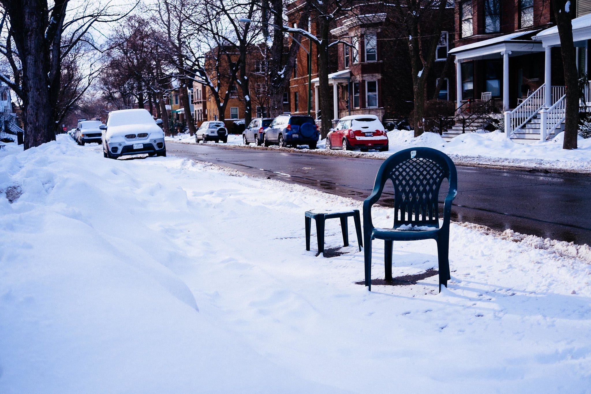 It’s snowing everywhere again so it’s time to talk about one of our silliest traditions: reserving an on-street parking spot. “Dibs” is a uniquely American phenomenon and it’s unique to only some cities in the US—big, snowy Northeastern and Midwestern cities (but not, curiously, New York). To call “dibs” on a street parking spot, an industrious shoveler will dig out a heavily snowed-in space and plant in its place a lawn chair, a mic stand, an orange parking cone, a child’s toy, an emblem of sorts, to mark that this spot is the re…