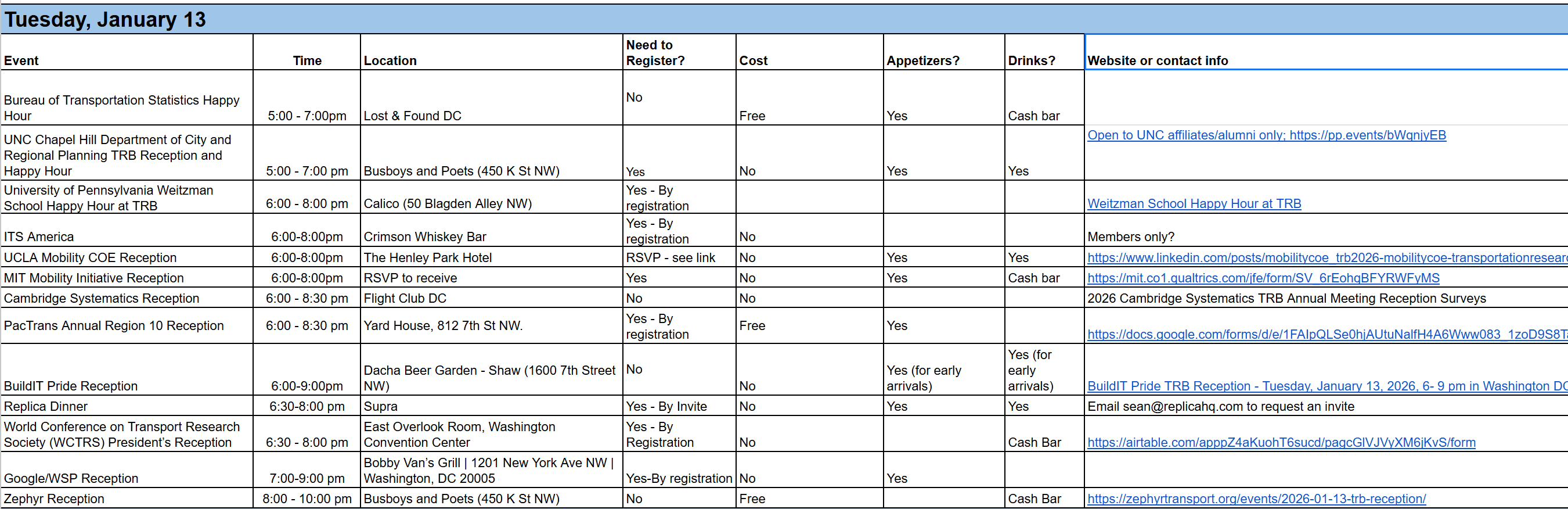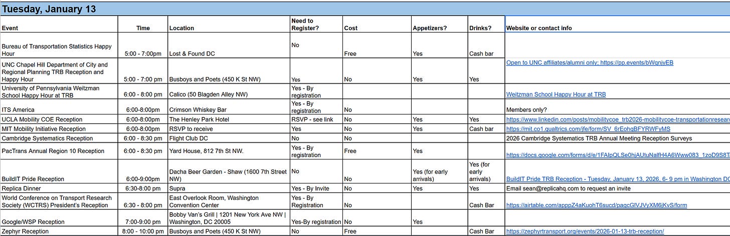 Each January, the Transportation Research Board (TRB) hosts its annual meeting (AM) in Washington DC’s Washington Convention Center.2 And three years from four I attend the hallways and happy hours portion of the conference—meaning I make my way to DC and spend four to five days taking meetings, coffees, and lunches with colleagues and coworkers, new and old, to build and deepen relationships. I’ll say that in my career, gliding through downtown DC for a few days each January has been the most influential week in my burgeoning career.